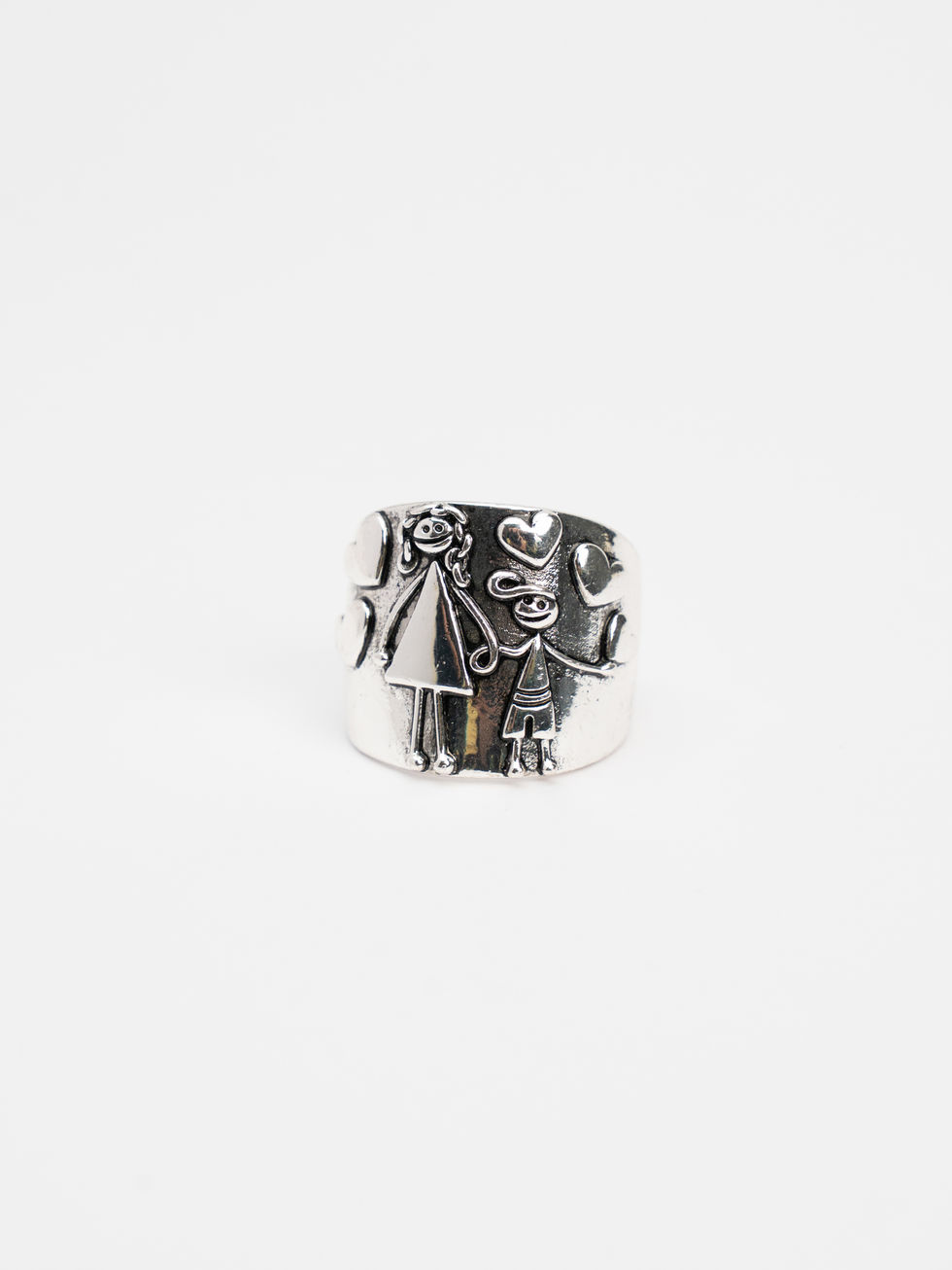 Anello statement in argento con superficie lavorata che raffigura due figure stilizzate unite da cuori e decorazioni floreali. Il design artistico celebra l'unione e l'amore con uno stile bohémien e originale. Ideale come regalo simbolico o per chi ama gioielli con significato.