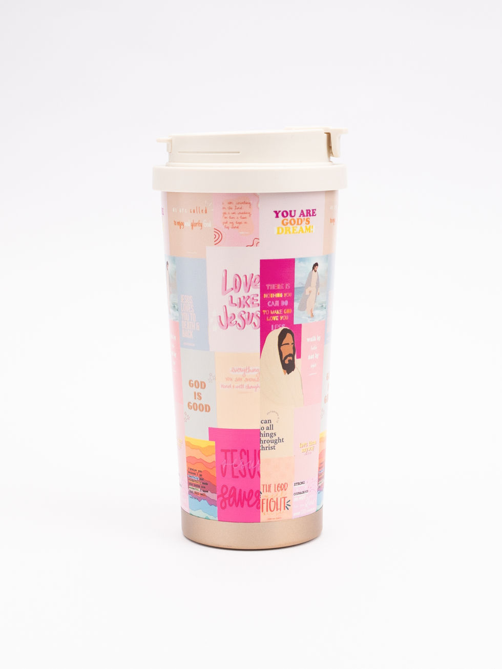 Tumbler termico con coperchio in colori pastello (rosa, azzurro, pesca) decorato con scritte motivazionali cristiane: "Love Like Jesus", "You Are God's Dream", "God is Good" e illustrazione di Gesù. Design allegro e giovanile, perfetto per portare bevande mantenendo la fede visibile.