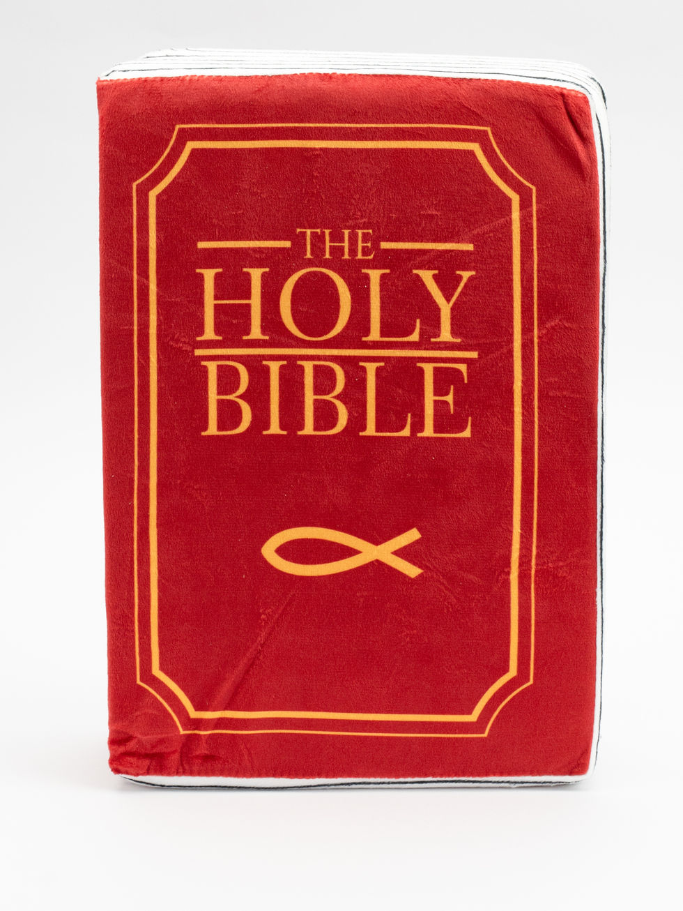 Morbida coperta cuscino a forma di libro sacro con scritta "The Holy Bible" in dorato su fondo rosso vellutato. Include il simbolo del pesce (Ichthys) cristiano. Ideale come regalo religioso, complemento d'arredo per camere da letto o come coperta da viaggio per momenti di preghiera e meditazione. Materiale soffice e confortevole.